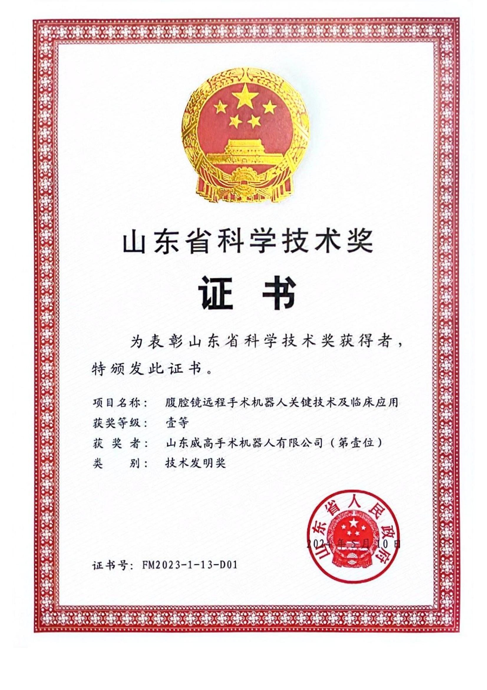 5月13日,山東省人民政府網(wǎng)站發(fā)布《山東省人民政府關(guān)于2023年度山東省科學(xué)技術(shù)獎(jiǎng)勵(lì)的決定》,經(jīng)省科學(xué)技術(shù)獎(jiǎng)勵(lì)評(píng)審委員會(huì)評(píng)審、省科學(xué)技術(shù)獎(jiǎng)勵(lì)委員會(huì)審定和省科技廳審核,授予由山東威高手術(shù)機(jī)器人有限公司作為第一完成單位參與的“腹腔鏡遠(yuǎn)程手術(shù)機(jī)器人關(guān)鍵技術(shù)及臨床應(yīng)用”成果為省技術(shù)發(fā)明獎(jiǎng)一等獎(jiǎng),這也是威海市唯一的一等獎(jiǎng)企業(yè)。